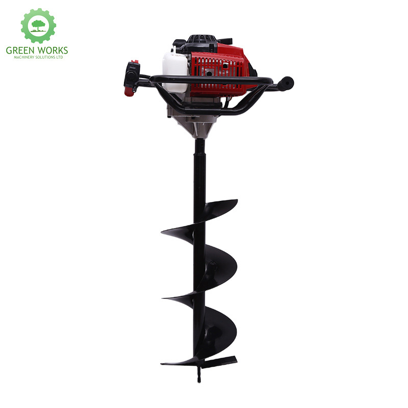 This is an earth drill with a 48 two - stroke engine. It has a working rod diameter of 28mm. The engine displacement is 63cc, with a power output of 2.4KW. The fuel tank has a capacity of 900ml, and the oil tank can hold 100ml. It offers multiple options for drill bit diameters and depths. The available drill bit diameters are 80mm, 100mm, 150mm, 200mm, and 250mm, all of which can achieve a drilling depth of either 800mm or 1000mm. This earth drill is well - suited for various earth - boring tasks, providing flexibility and sufficient power for efficient operation.