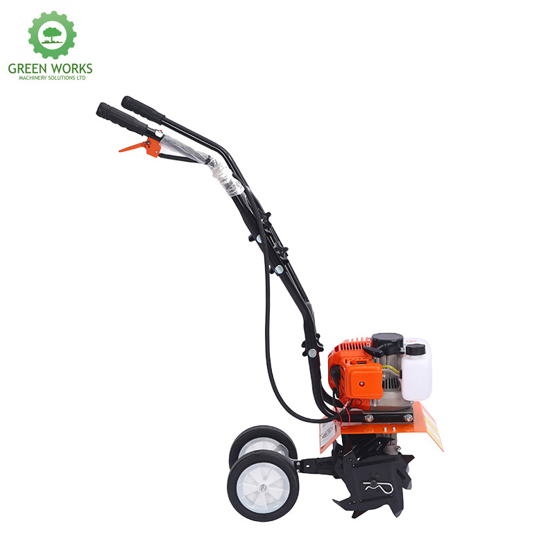 This tiller is equipped with a 1E44F - 5 type engine, which is a cold - air, two - stroke, single - cylinder gasoline engine. It has a power output of 1.9KW at 6500 - 7000r/min and a displacement of 52cc. The carburetor is of the diaphragm type, and the fuel ratio is 25:1. The engine idle speed ranges from 2800 - 3200r/min.
